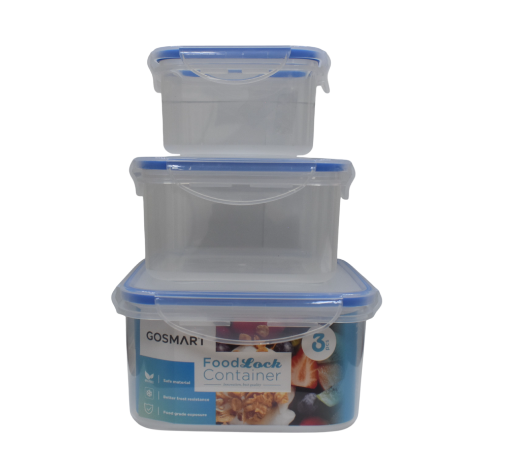 A range of food containers in various sizes, coming under our brand GoSmart: borosilicate glass heat resistant range – which are oven, microwave, freezer and dishwasher safe – and a range of food grade plastic container sets which can be used in microwave.